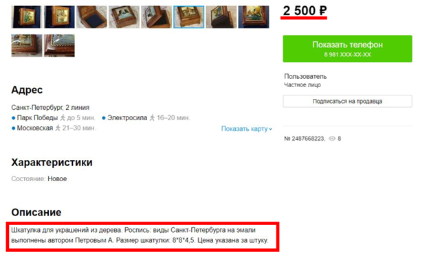 При этом на сайте Avito подобные шкатулки того же автора стоят всего 2,5 тыс. рублей. Ничем особенным, кроме размера они не отличаются. Связаться с автором произведений такого дорогого искусства не удалось.