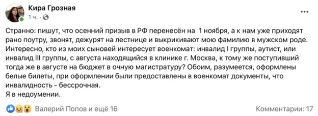 В Петербурге участились случаи нарушения требований при призыве на службу в рамках частичной мобилизации. Так, петербурский военкомат пытался вручить повестки сыновьям-инвалидам писательницы Киры Грозной.