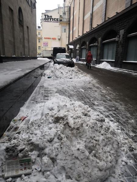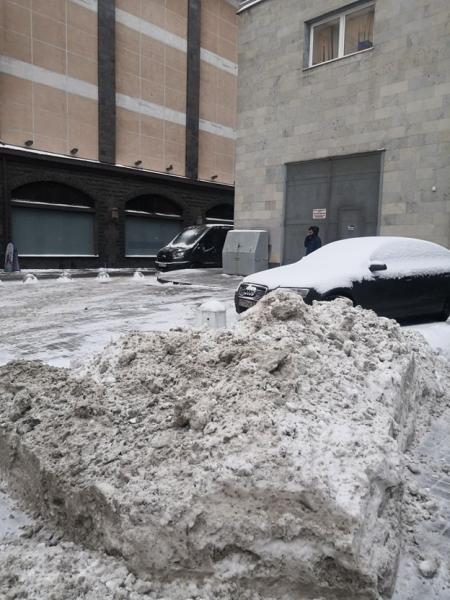 Горы снега скопились и в центре города — в переулке Щербакова.