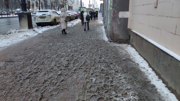 Дворники не потрудились убрать растаявшую массу из снега и реагентов и на Московском проспекте возле площади Победы.