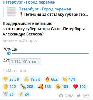 В Северной столице продолжают активно обсуждать результаты опроса, опубликованного в Telegram-канале движения «Город Перемен». На сегодняшний день более 1,4 млн граждан приняли участие в голосовании, 78% из которых поддержали петицию за увольнение градоначальника.